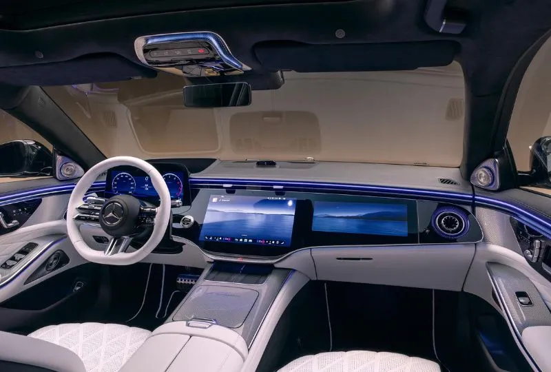 Không gian cabin của S-Class 2027 là nơi Mercedes thể hiện rõ nhất triết lý “luxury meets future”. Các mảng ốp gỗ truyền thống được tinh giản, nhường chỗ cho hệ thống ba màn hình kỹ thuật số trải dài bảng táp-lô, trong đó màn hình trung tâm kích thước 14,4 inch đóng vai trò trung tâm điều khiển. Hai màn hình phụ 12,3 inch hoàn thiện một không gian mang đậm hơi thở viễn tưởng, đúng chất sedan đầu bảng của thế kỷ 21.