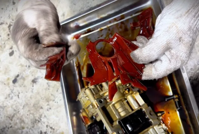Phần máng xích nhựa bị nứt hoặc gãy sẽ được tháo bỏ hoàn toàn. Kỹ thuật viên đồng thời kiểm tra xem có mảnh vỡ nào lọt vào khoang máy hay không để tránh gây hư hại tiếp theo.